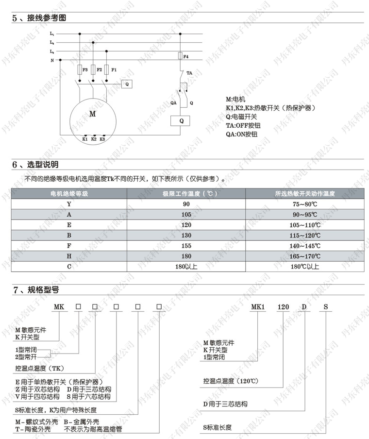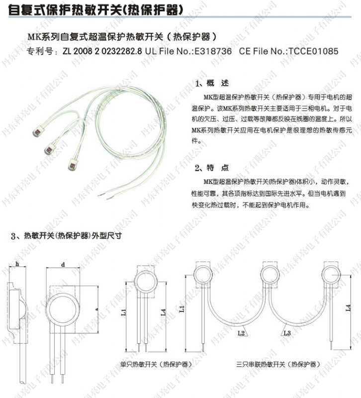 公司主要生产经营电机保护PTC热敏电阻、电机防潮加热带、电机保护热敏开关、电机轴承及线圈温度数字显示传感器,以及与传感器配套的智能温度显示仪表等产品,并可根据用户需求可以特殊定制。