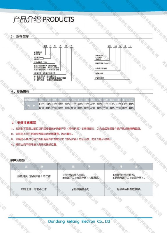 公司主要生产经营电机保护PTC热敏电阻、电机防潮加热带、电机保护热敏开关、电机轴承及线圈温度数字显示传感器,以及与传感器配套的智能温度显示仪表等产品,并可根据用户需求可以特殊定制。